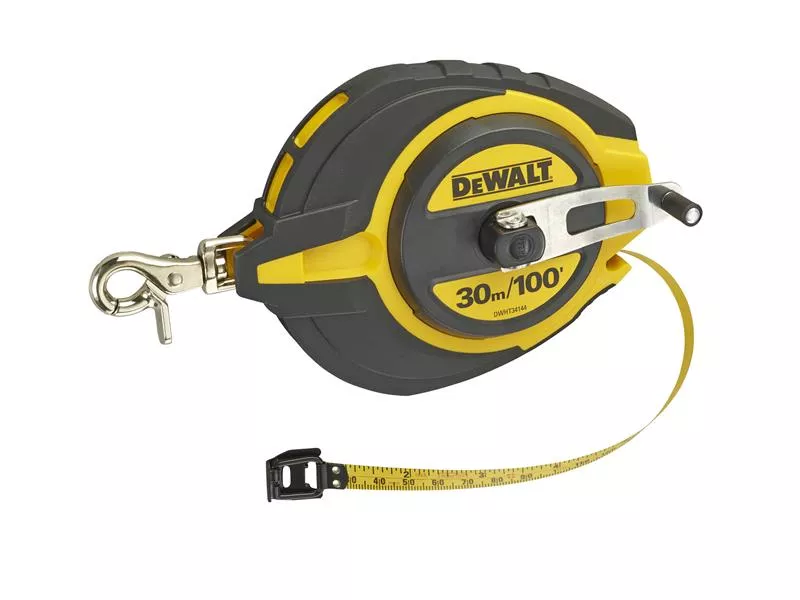 The DEWALT® Steel Long Tape Measure features a blade-release button and a 5-to-1 gear ratio for fast blade rewinds for efficiency. The long tape's stainless-steel crank arm provides durability for demanding job-sites. A spring-loaded carabiner attachment offers great portability.