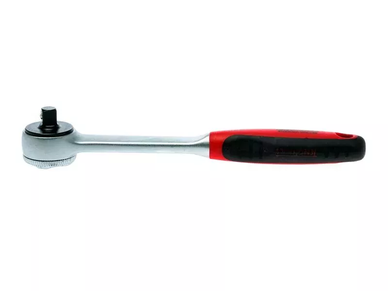The button for quick socket release is level with the ratchet head, which prevents accidental button activation and the loss of the socket, while the ergonomic two-component handle provides a firm grip.
