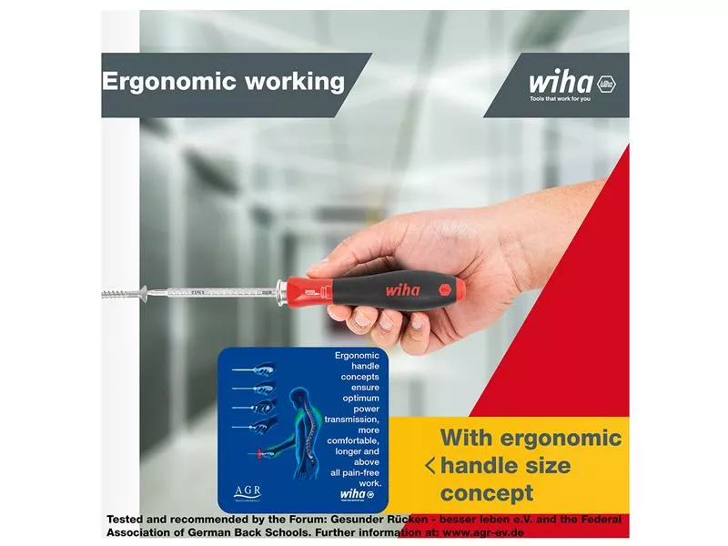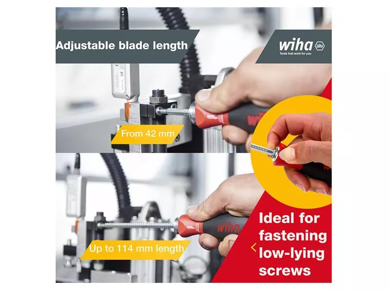 1 x SoftFinish®-telescopic Screwdriver Handle. The patented SoftFinish® handle ensures work is kind to hands and muscles. Recommended by doctors and therapists at the German Campaign for Healthier Backs. A click-stop ball clamp guarantees a secure hold for blades. Compatible with all Wiha SYSTEM 6 interchangeable blades (series 284).