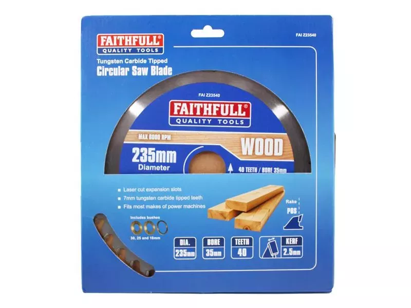 Faithfull Professional TCT Circular Saw Blade with 7mm Tungsten Carbide Tipped teeth to ensure a long working life and accuracy of cut. Each blade has laser cut expansion slots to improve their performance by reducing heat build up.