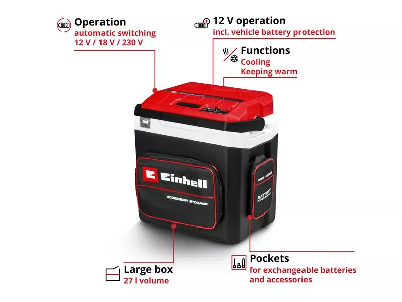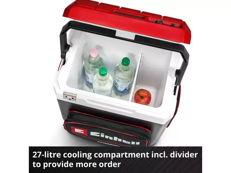 The Einhell TE-COL 18/27 li-Solo Cordless Coolbox is ideal on the go, whether on excursions or at the construction site. Whether cool drinks in summer or a warm meal in between: A cordless cooling box is a must-have for leisure trips as well as for any well-deserved lunch break at the construction site.