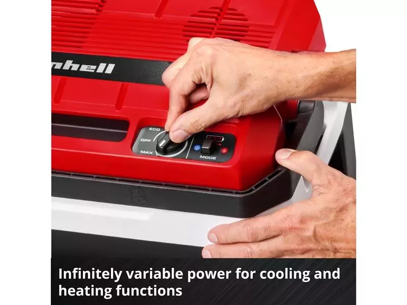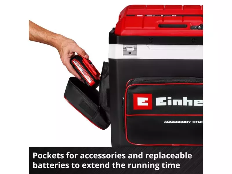 Part of the Einhell Power X‑Change family and can therefore be combined with any battery in the system series. At the same time, it comes with a 230 V and a 12 V cable. The cooling box automatically selects the operating mode depending on the existing power source. This way, it can be pre-cooled at home using a socket and then cooled on the go using the cigarette lighter socket of your car. For 1 V operation, the cooling box is equipped with a vehicle battery protection that prevents any deep discharge of your battery. Afterwards, contents can be kept cool using the battery.