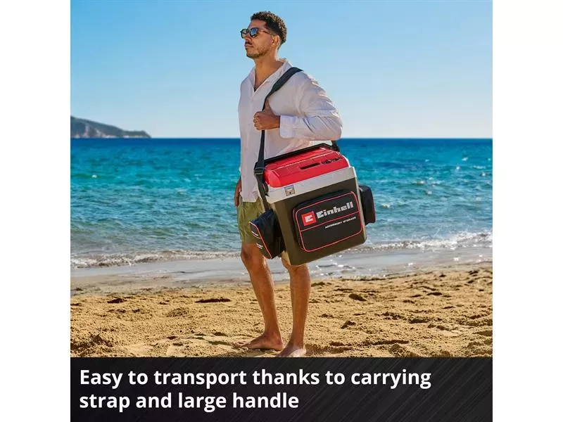 With its energy efficiency class D, the cordless cooling box has a low power consumption. A battery charge indicator is integrated directly into the device. The cooling or heating functions can be selected via a central switch. Using the rotary switch, the cooling capacity can be set infinitely up to 20°C below the respective ambient temperature. The keep-warm function can be adjusted to max. 60°C. For easy transportation, the cooling box comes with an adjustable carrying strap with shoulder pad and a large carrying handle, which can also keep the lid of the cooling box open if necessary.