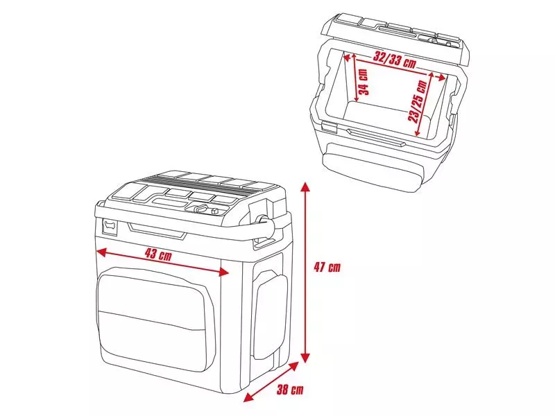 The cooling box has a volume of 27 litres and can hold 36 cans (of 0.33 l each), 20 bottles (of 0.5 l each) or 6 large 1.5 l bottles. A flexible divider is supplied to divide the cold room, and there is also a bottle opener integrated into the housing. In addition, the box is equipped with a large pocket for accessories, a side pocket with a battery holder and a side pocket for a replaceable battery to extend the running time.