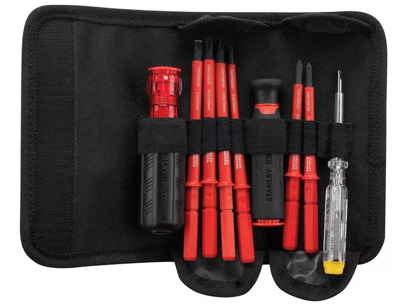 The Stanley 10 Piece VDE Multi-Bit Screwdriver Set contains two handles that cover a range of applications: a small precision handle fitted with swivelling head and a large, comfortable soft grip handle that provides excellent torque for driving screws. Shot blasted tips for improved torque and corrosion protection. Supplied in a handy storage pouch.