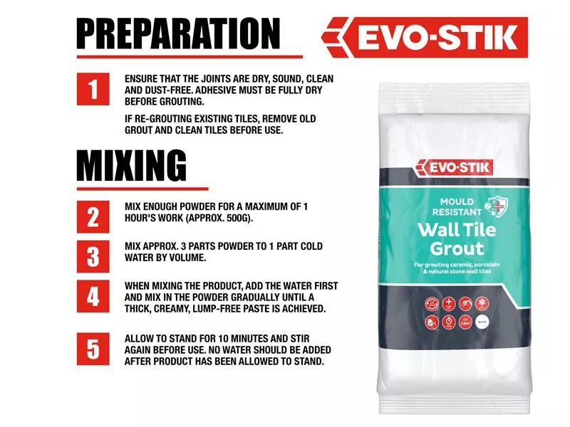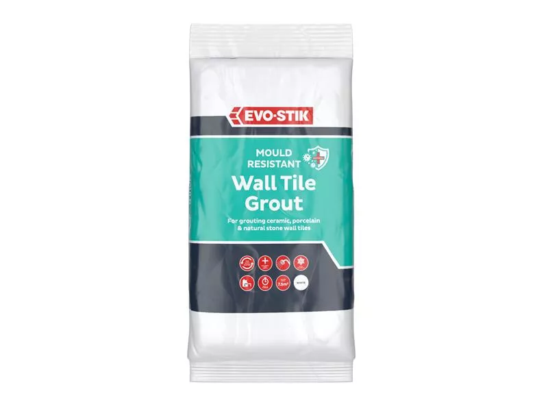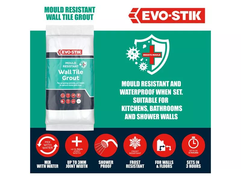 Evo-Stik Wall Tile Grout Mould Resistant is a fast setting cement-based grout, suitable for finishing joints of internal and external ceramic tile installations. When set, it is completely waterproof and will not wash out of joints, making it ideal for use in areas subject to frequent wetting and condensation such as power showers, kitchens and bathrooms.