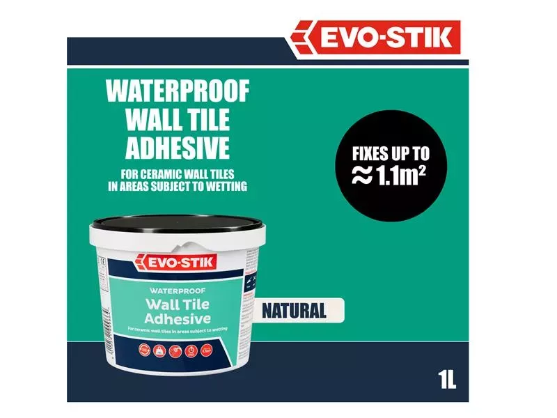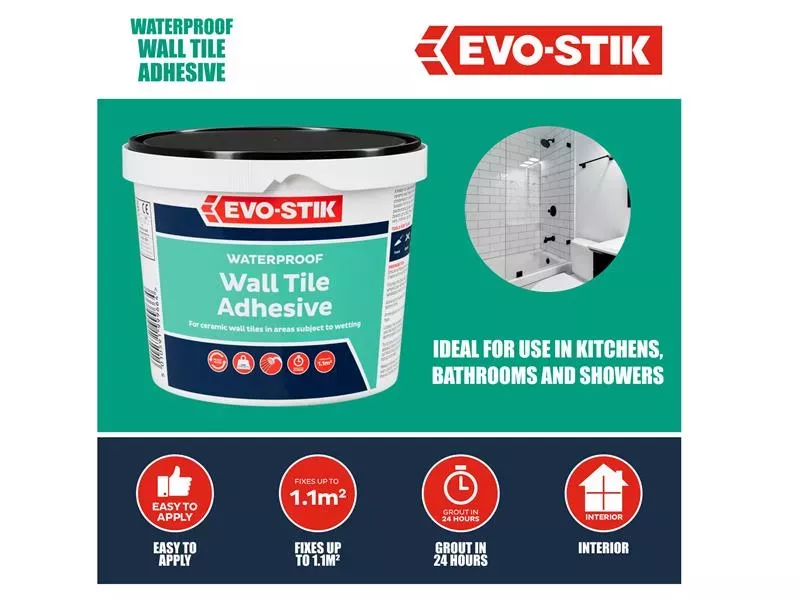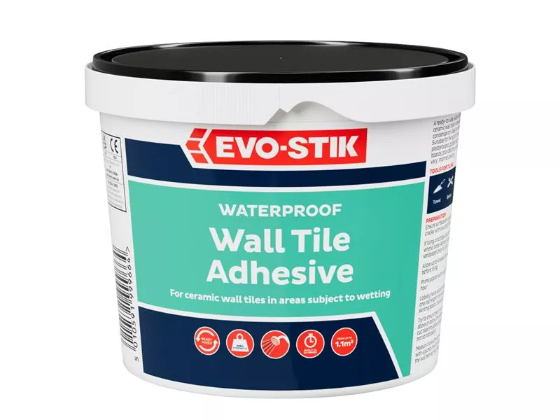 The Evo-Stik Waterproof Wall Tile Adhesive is ready-mixed, easy to use and suitable for fixing ceramic tiles onto most interior walls and backgrounds, including cement rendering, plaster, plywood, plasterboard, blockboard, wood chipboard, old glazed tiles, glazed bricks and painted surfaces.