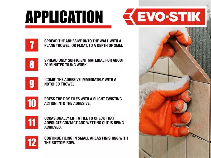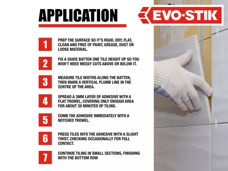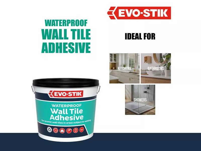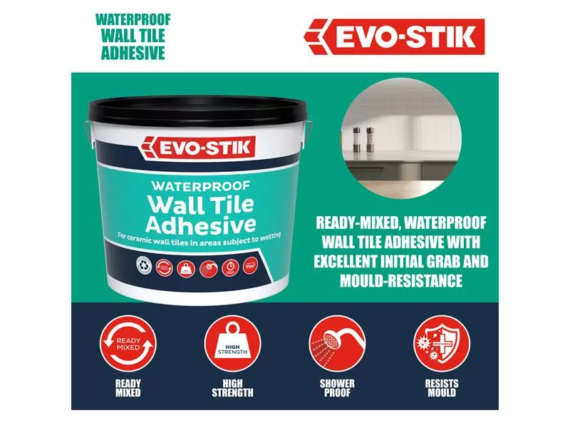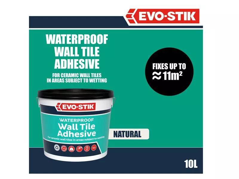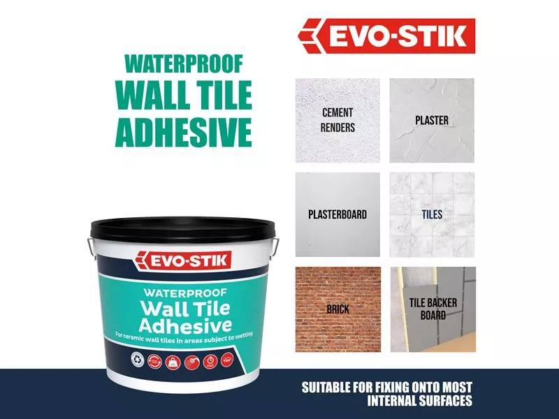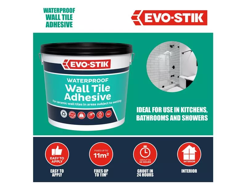 The Evo-Stik Waterproof Wall Tile Adhesive is ready-mixed, easy to use and suitable for fixing ceramic tiles onto most interior walls and backgrounds, including cement rendering, plaster, plywood, plasterboard, blockboard, wood chipboard, old glazed tiles, glazed bricks and painted surfaces.