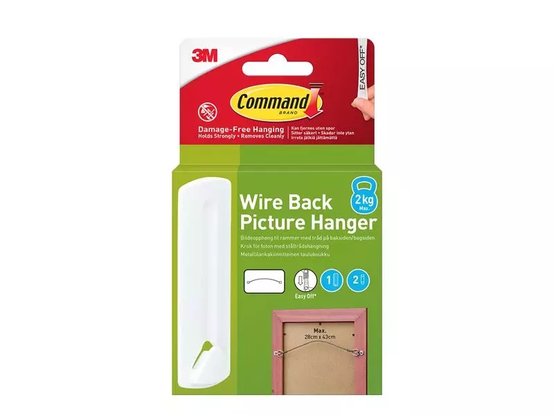 Command™ Picture Hanger for wire-backed frames. No need for nails or screws. Command™ Picture Hangers are easy to use and help you decorate your walls without leaving any marks. Decorate, organise and celebrate damage free with Command™. Indoor use only. Recommended for use on painted walls, finished wood, painted concrete cinder blocks, laminate, glass, metal and tiles.