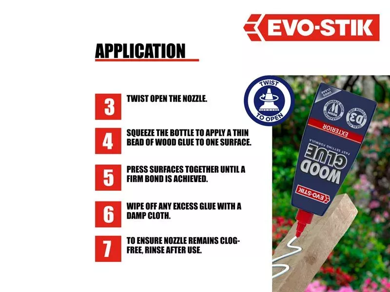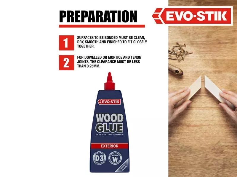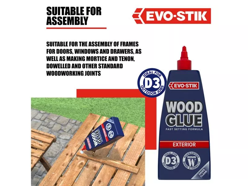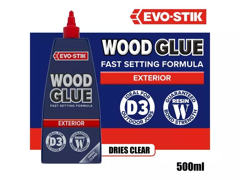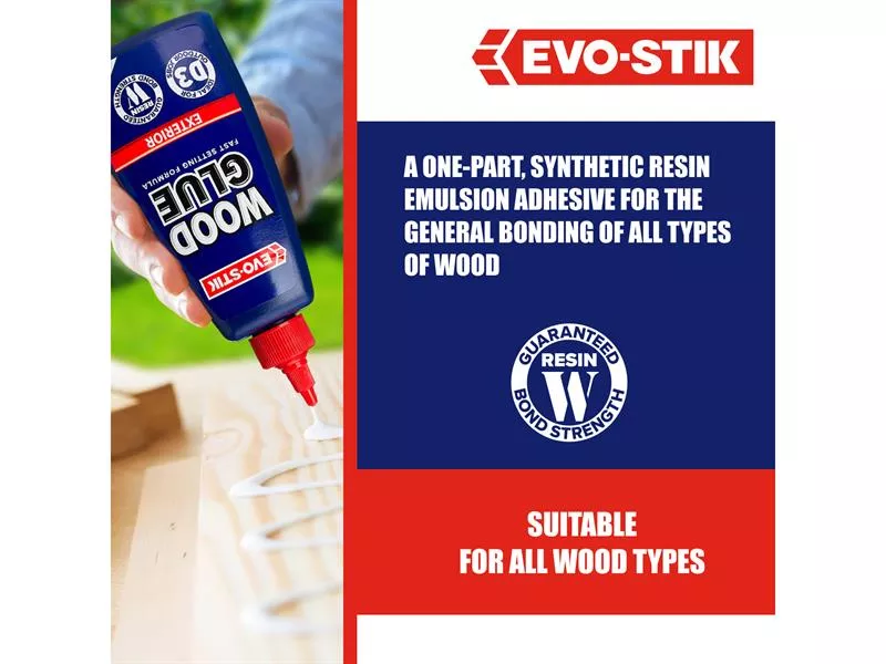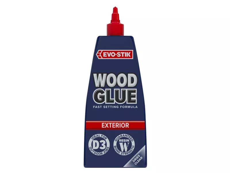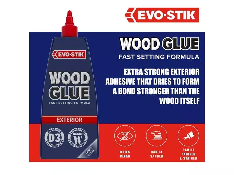 EVO-STIK Wood Glue Exterior is fast setting, extra strong and weatherproof, complies with EN 204 Type D3. Suitable for interior or exterior use and dries to form a bond stronger than the wood itself. Dries to a clear finish that can be sanded, painted or stained. The anti-roll bottle has a no mess, clog-free nozzle and twist to seal cap.