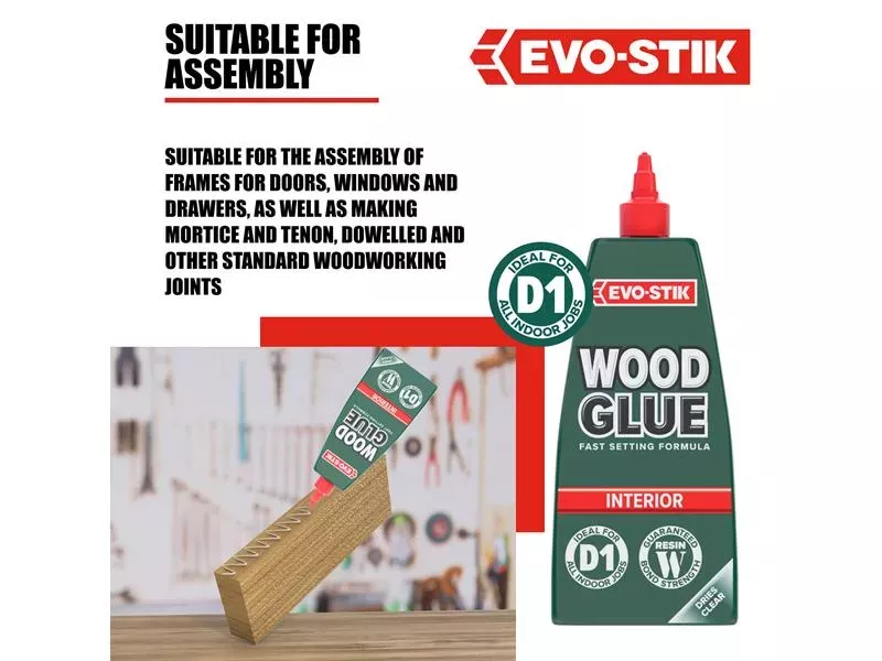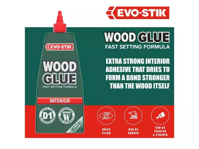 EVO-STIK Wood Glue Interior is an extra strong, fast-setting glue that dries to form a bond stronger than the wood itself. It dries to a clear finish that can be sanded, painted or stained and is suitable for all types of wood.